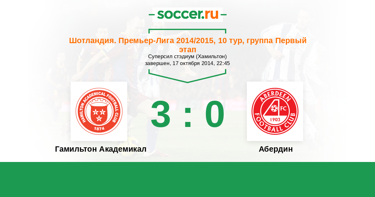 Шотландия. Премьер-Лига 25.10.2016 Гамильтон Академикал Логотип футбольный клуб Гамильтон Академикал 1:0 Логотип футбольный клуб Абердин Абердин