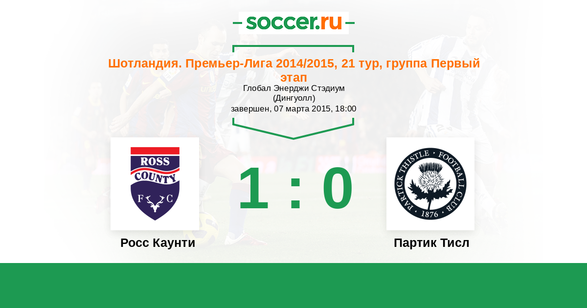 Шотландия. Премьер-Лига 01.03.2014 Росс Каунти Логотип футбольный клуб Росс Каунти (Дингволл) 1:1 Логотип футбольный клуб Партик Тисл (Глазго) Партик Тисл