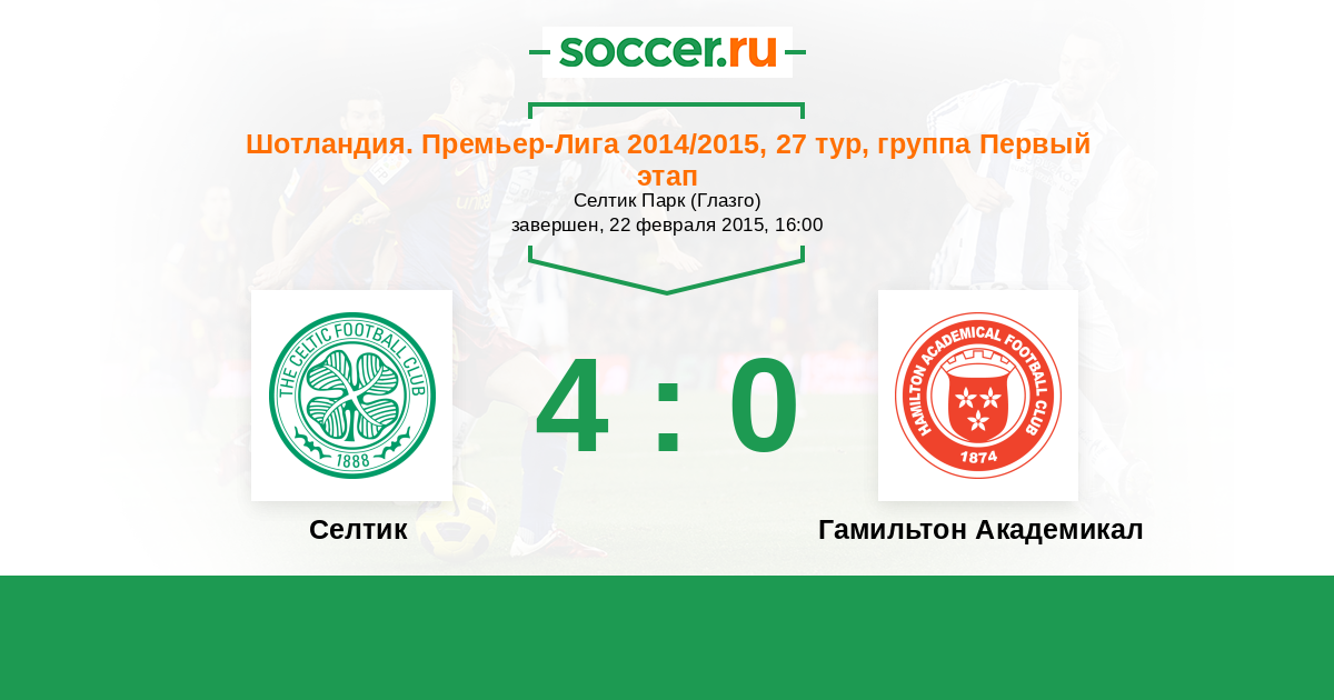 Шотландия. Премьер-Лига 25.02.2017 Селтик Логотип футбольный клуб Селтик (Глазго) 2:0 Логотип футбольный клуб Гамильтон Академикал Гамильтон Академикал