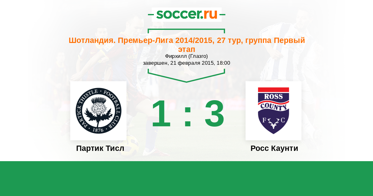 Шотландия. Премьер-Лига 07.03.2015 Росс Каунти Логотип футбольный клуб Росс Каунти (Дингволл) 1:0 Логотип футбольный клуб Партик Тисл (Глазго) Партик Тисл