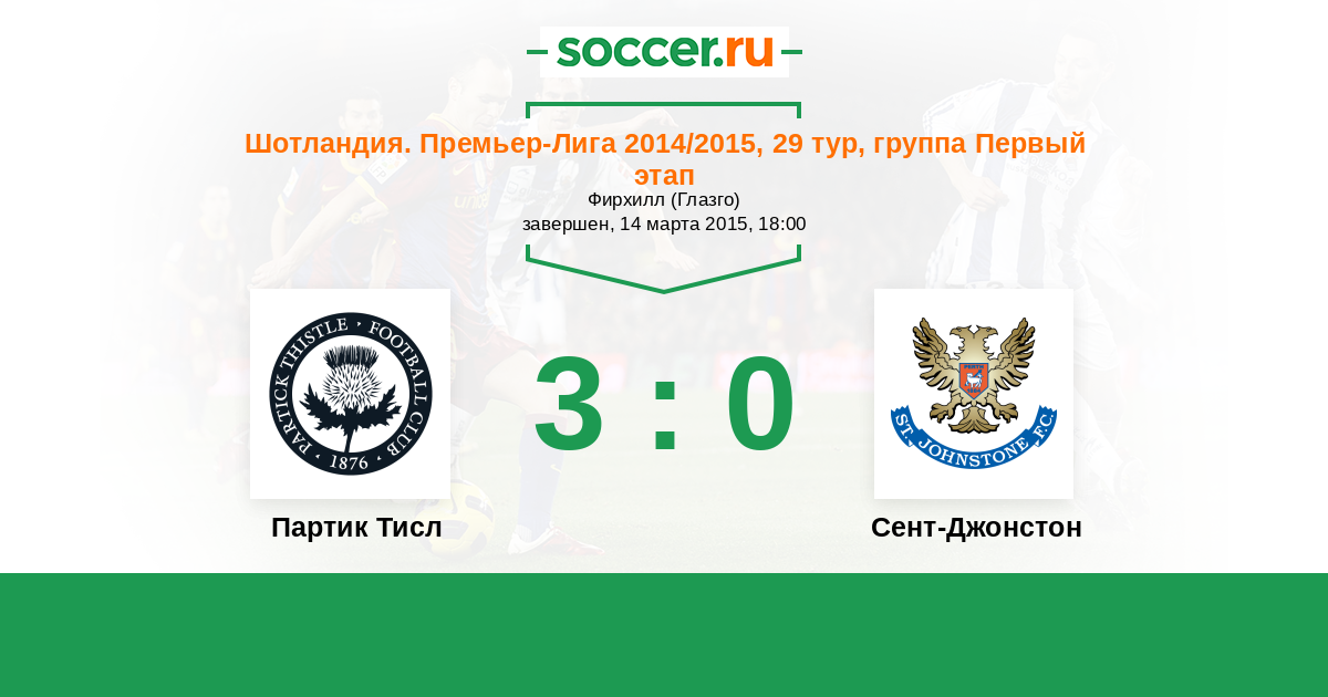 Шотландия. Премьер-Лига 29.03.2014 Сент-Джонстон Логотип футбольный клуб Сент-Джонстон (Перт) 1:1 Логотип футбольный клуб Партик Тисл (Глазго) Партик Тисл