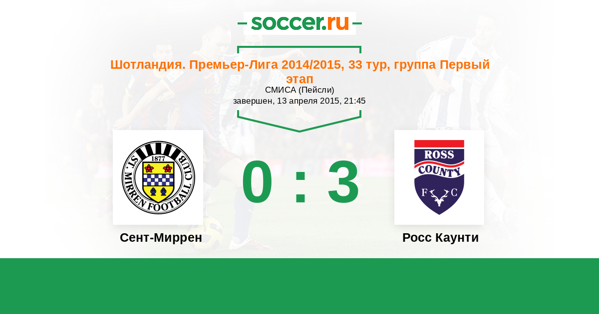 Шотландия. Премьер-Лига 09.05.2015 Росс Каунти Логотип футбольный клуб Росс Каунти (Дингволл) 1:2 Логотип футбольный клуб Сент-Миррен (Пейсли) Сент-Миррен