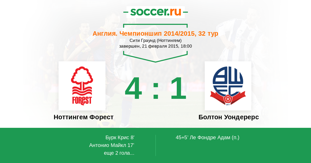 Протокол матча Ноттингем Форест против Болтон Уондерерс