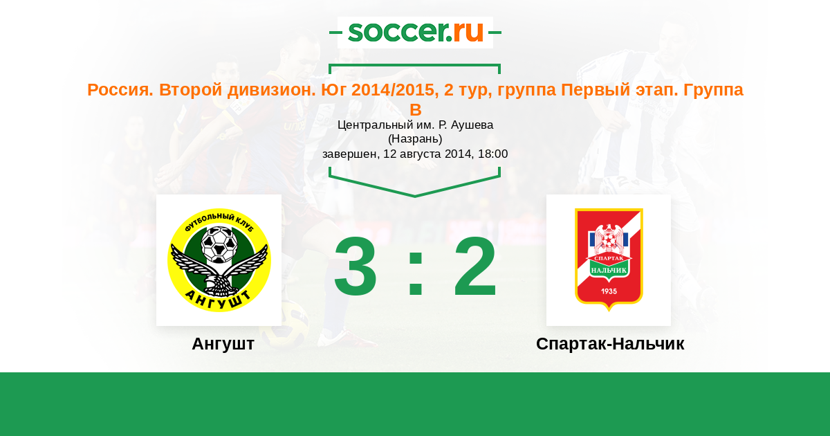 Россия. Вторая лига. Группа 1 01.09.2015 Спартак-Нальчик Логотип футбольный клуб Спартак-Нальчик 2:0 Логотип футбольный клуб Ангушт (Назрань) Ангушт