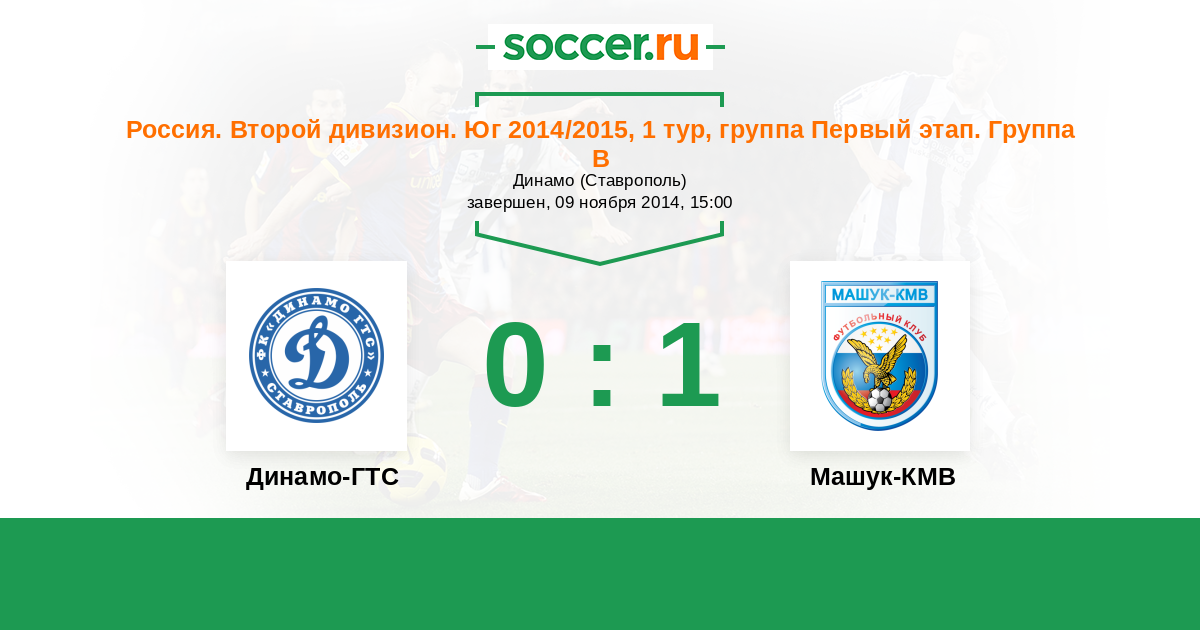 Россия. Вторая лига. Группа 1 03.04.2015 Машук-КМВ Логотип футбольный клуб Машук-КМВ (Пятигорск) 0:2 Логотип футбольный клуб Динамо-ГТС (Ставрополь) Динамо-ГТС