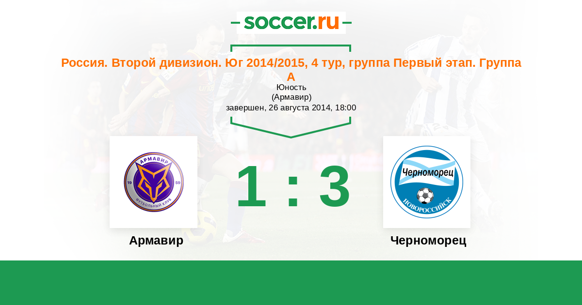 Россия. Вторая лига. Группа 1 17.08.2013 Черноморец Логотип футбольный клуб Черноморец (Новороссийск) 3:0 Логотип футбольный клуб Торпедо Армавир Торпедо Армавир