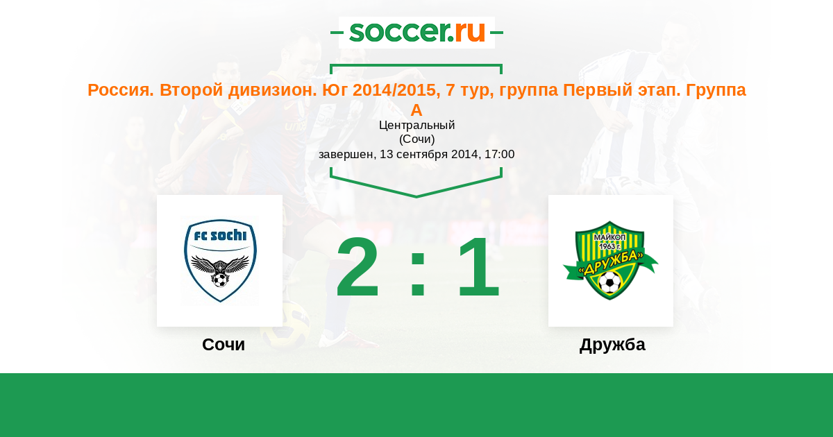 Россия. Вторая лига. Группа 1 13.11.2014 Дружба Логотип футбольный клуб Дружба (Майкоп) 0:0 Логотип футбольный клуб Сочи Сочи