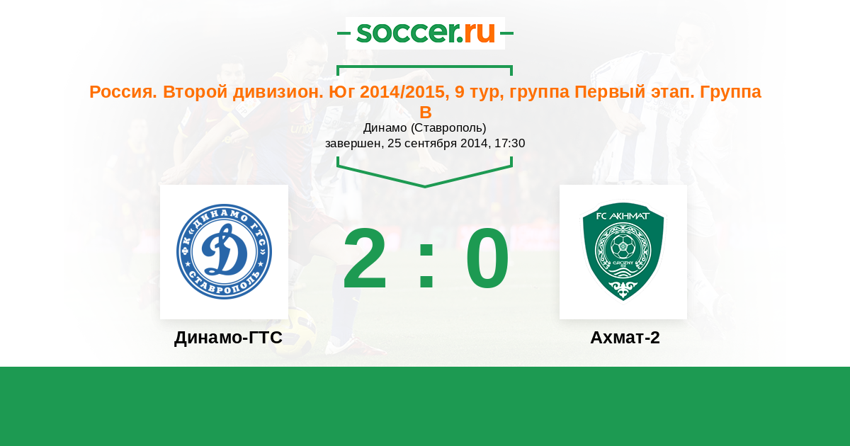 Россия. Вторая лига. Группа 1 24.11.2014 Ахмат-2 Логотип футбольный клуб Ахмат-2 (Грозный) 1:0 Логотип футбольный клуб Динамо-ГТС (Ставрополь) Динамо-ГТС