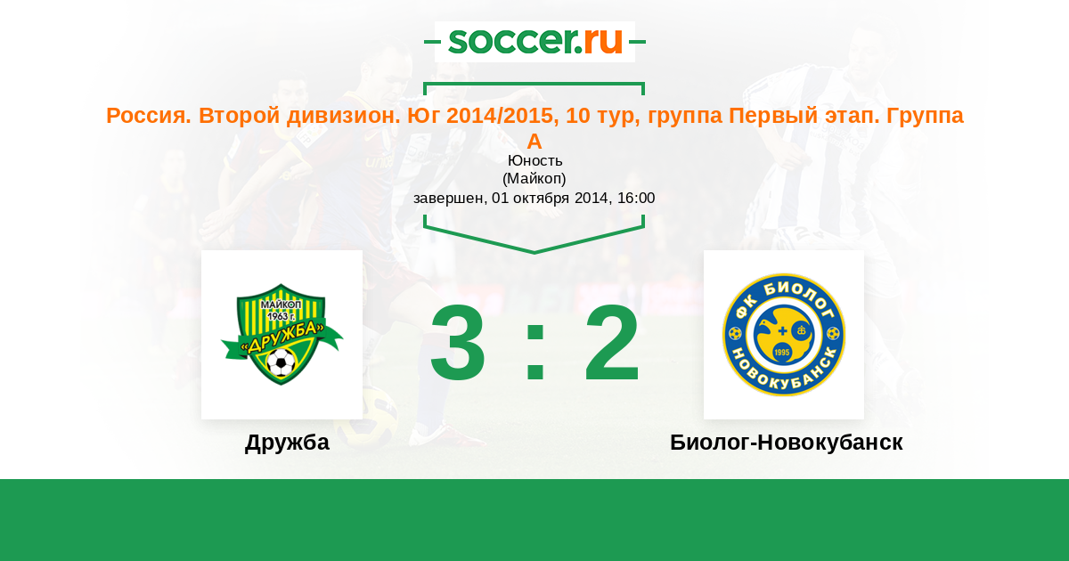 Россия. Вторая лига. Группа 1 16.10.2016 Биолог-Новокубанск Логотип футбольный клуб Биолог-Новокубанск 2:0 Логотип футбольный клуб Дружба (Майкоп) Дружба