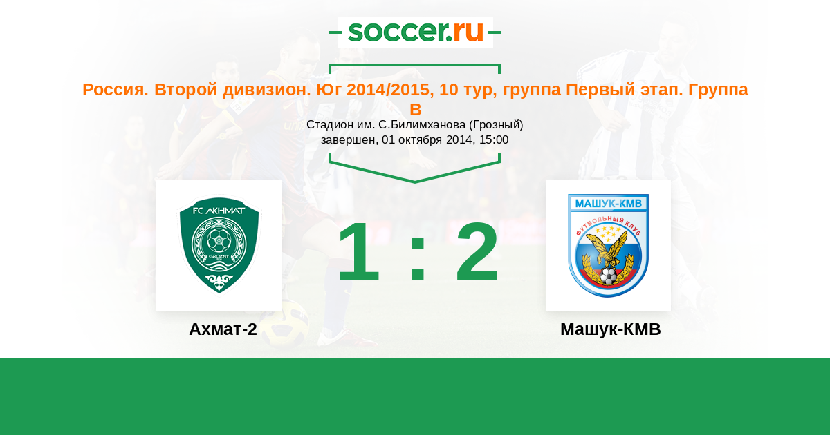 Россия. Вторая лига. Группа 1 21.09.2015 Ахмат-2 Логотип футбольный клуб Ахмат-2 (Грозный) 0:0 Логотип футбольный клуб Машук-КМВ (Пятигорск) Машук-КМВ