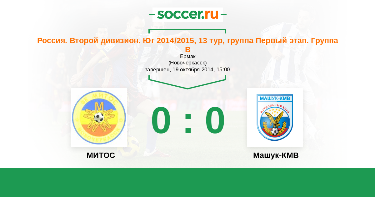 Россия. Вторая лига. Группа 1 20.08.2014 Машук-КМВ Логотип футбольный клуб Машук-КМВ (Пятигорск) 0:2 Логотип футбольный клуб МИТОС (Новочеркасск) МИТОС