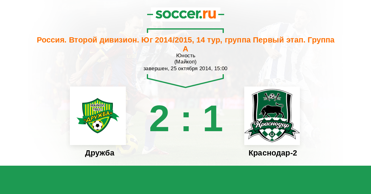 Россия. Вторая лига. Группа 1 26.08.2014 Краснодар-2 Логотип футбольный клуб Краснодар-2 3:1 Логотип футбольный клуб Дружба (Майкоп) Дружба