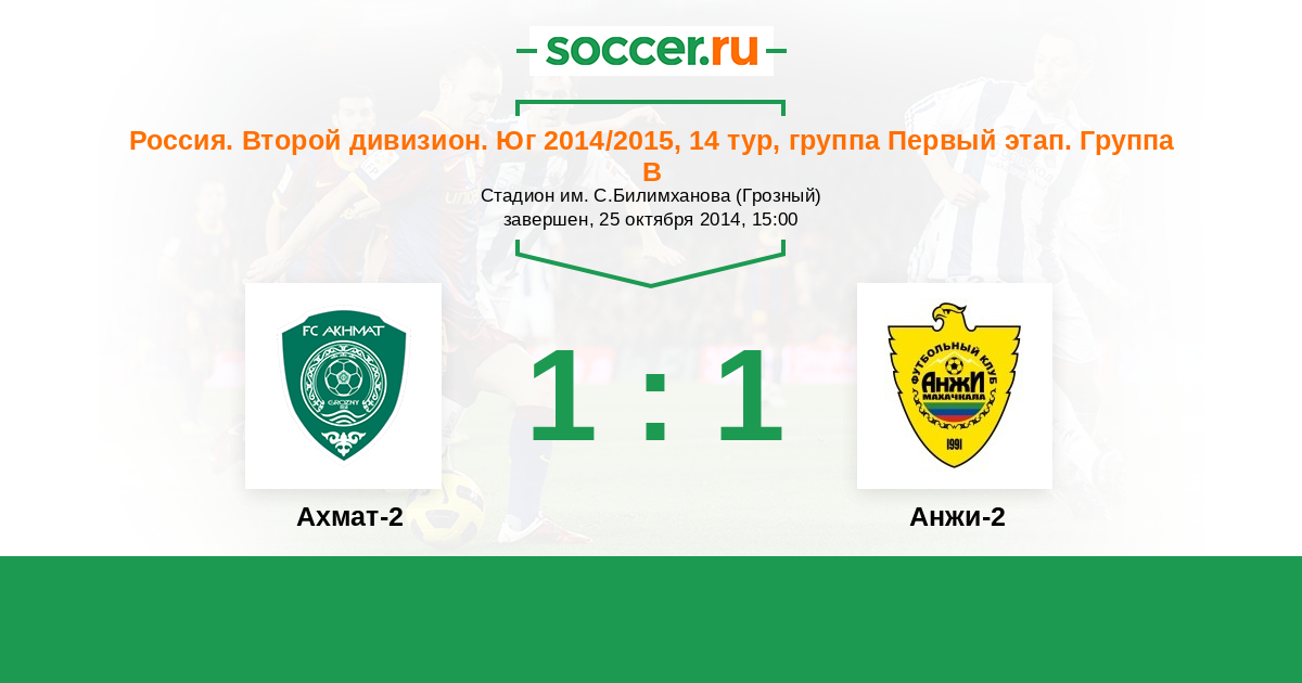 Россия. Вторая лига. Группа 1 26.08.2014 Анжи-2 Логотип футбольный клуб Анжи-2 (Махачкала) 0:0 Логотип футбольный клуб Ахмат-2 (Грозный) Ахмат-2