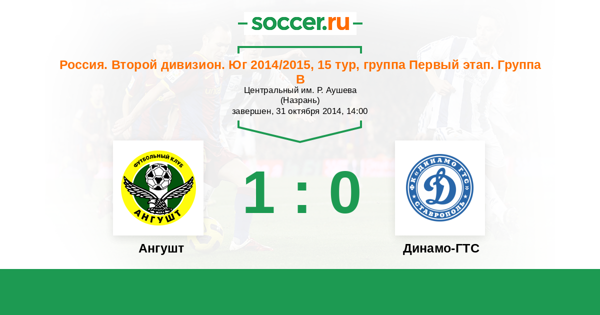 Россия. Вторая лига. Группа 1 01.09.2014 Динамо-ГТС Логотип футбольный клуб Динамо-ГТС (Ставрополь) 3:0 Логотип футбольный клуб Ангушт (Назрань) Ангушт