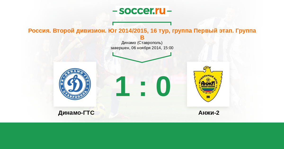 Россия. Вторая лига. Группа 1 07.09.2014 Анжи-2 Логотип футбольный клуб Анжи-2 (Махачкала) 0:1 Логотип футбольный клуб Динамо-ГТС (Ставрополь) Динамо-ГТС