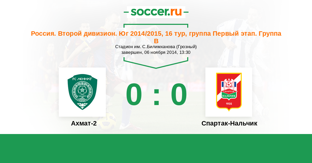 Россия. Вторая лига. Группа 1 07.09.2014 Спартак-Нальчик Логотип футбольный клуб Спартак-Нальчик 0:0 Логотип футбольный клуб Ахмат-2 (Грозный) Ахмат-2