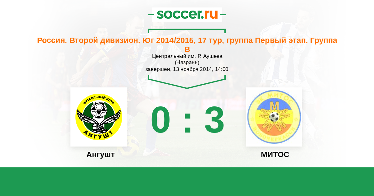 Россия. Вторая лига. Группа 1 07.09.2015 Ангушт Логотип футбольный клуб Ангушт (Назрань) 2:1 Логотип футбольный клуб МИТОС (Новочеркасск) МИТОС