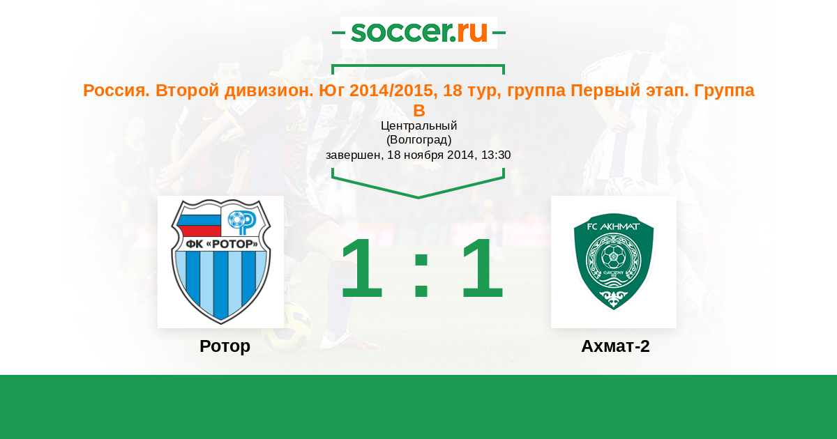Россия. Вторая лига. Группа 1 19.09.2014 Ахмат-2 Логотип футбольный клуб Ахмат-2 (Грозный) 0:0 Логотип футбольный клуб Ротор (Волгоград) Ротор