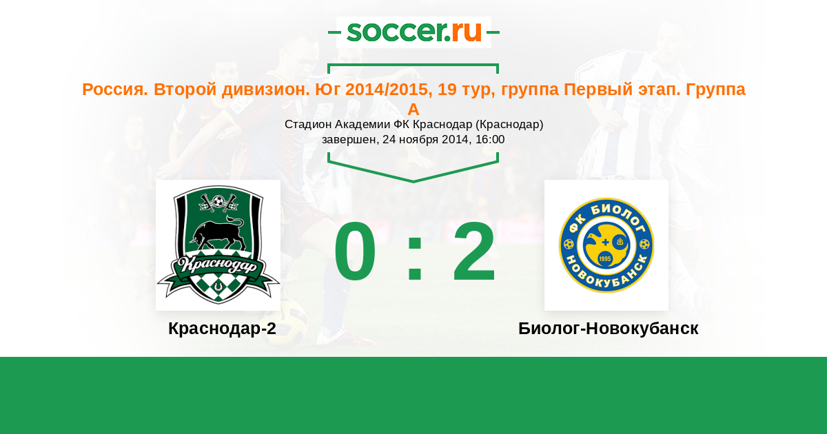 Россия. Вторая лига. Группа 1 25.09.2014 Биолог-Новокубанск Логотип футбольный клуб Биолог-Новокубанск 2:0 Логотип футбольный клуб Краснодар-2 Краснодар-2