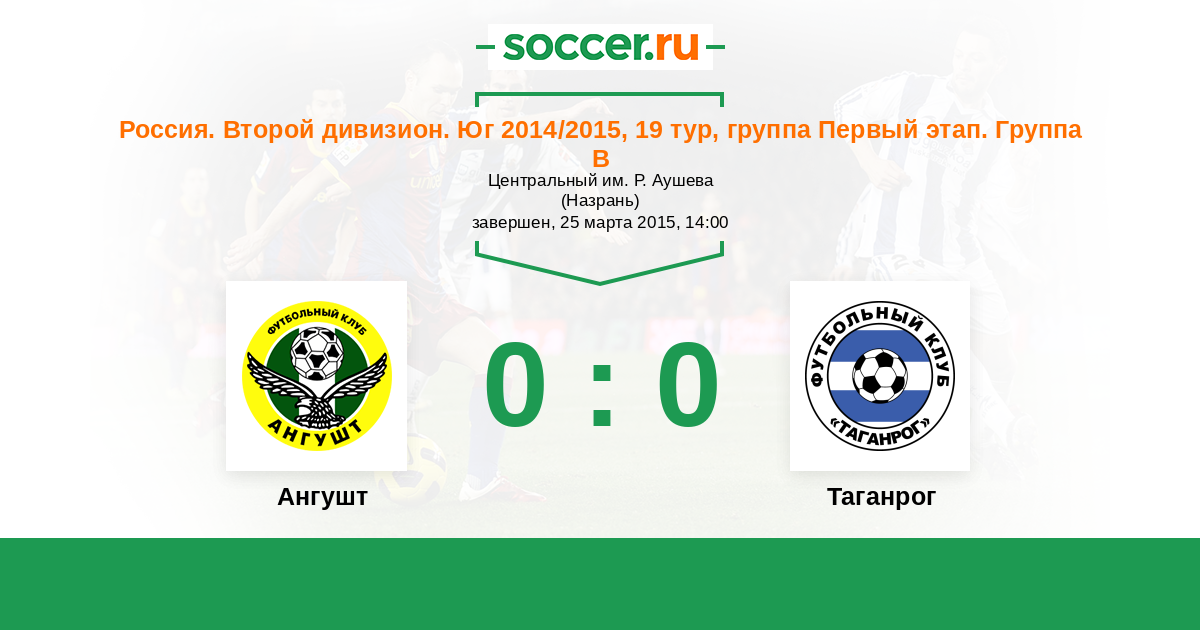 Россия. Вторая лига. Группа 1 25.09.2014 Таганрог Логотип футбольный клуб Таганрог 2:0 Логотип футбольный клуб Ангушт (Назрань) Ангушт