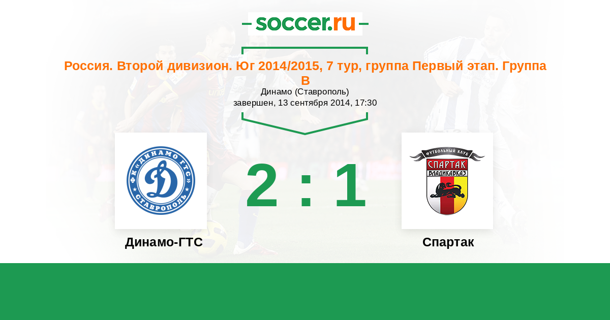Россия. Вторая лига. Группа 1 19.05.2015 Динамо-ГТС Логотип футбольный клуб Динамо-ГТС (Ставрополь) 4:2 Логотип футбольный клуб Торпедо Армавир Торпедо Армавир