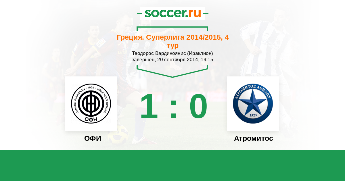 Греция. Суперлига 26.03.2014 ОФИ Логотип футбольный клуб ОФИ (Ираклион) 2:0 Логотип футбольный клуб Атромитос (Перистери) Атромитос