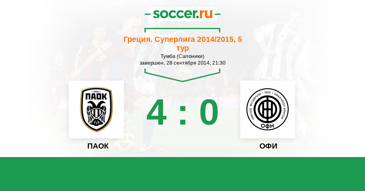 Греция. Суперлига 29.09.2013 ОФИ Логотип футбольный клуб ОФИ (Ираклион) 1:1 Логотип футбольный клуб ПАОК (Салоники) ПАОК