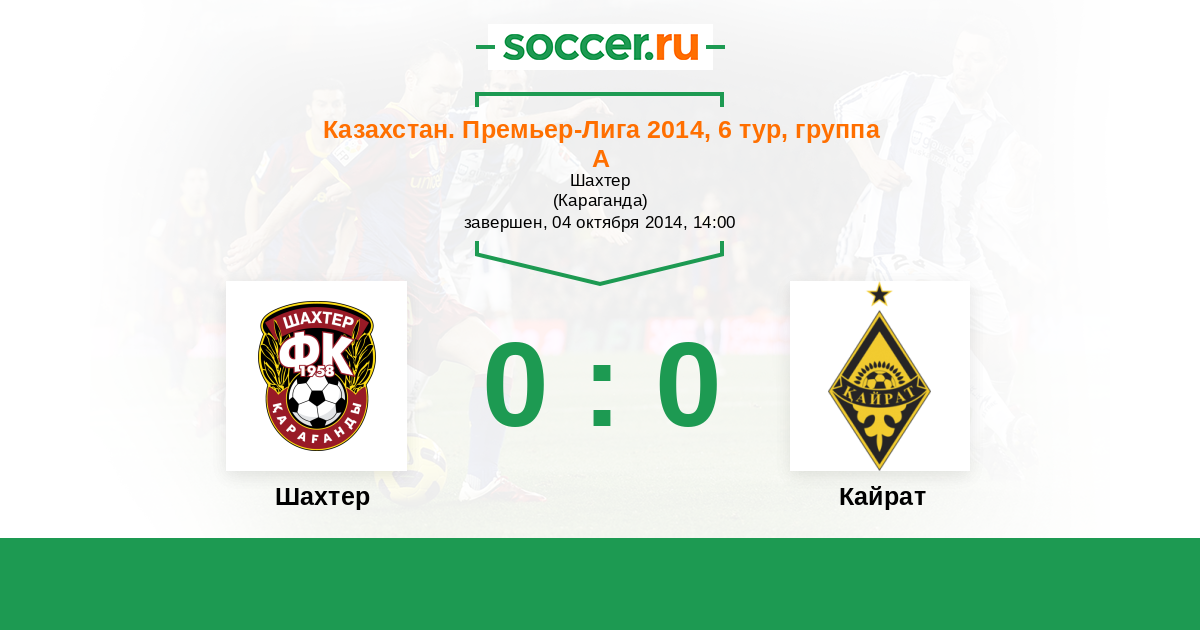 Казахстан. Премьер-лига 13.07.2014 Шахтер Логотип футбольный клуб Шахтер (Караганда) 1:0 Логотип футбольный клуб Кайрат (Алматы) Кайрат