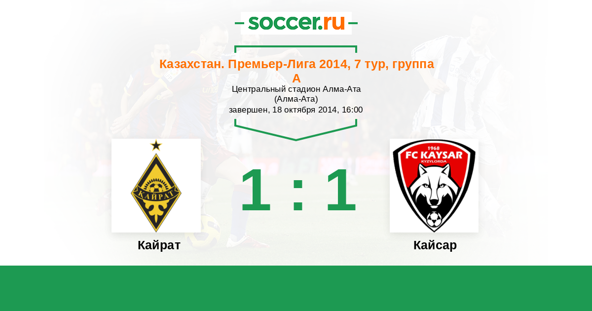 Казахстан. Премьер-лига 14.09.2014 Кайсар Логотип футбольный клуб Кайсар (Кызылорда) 0:2 Логотип футбольный клуб Кайрат (Алматы) Кайрат