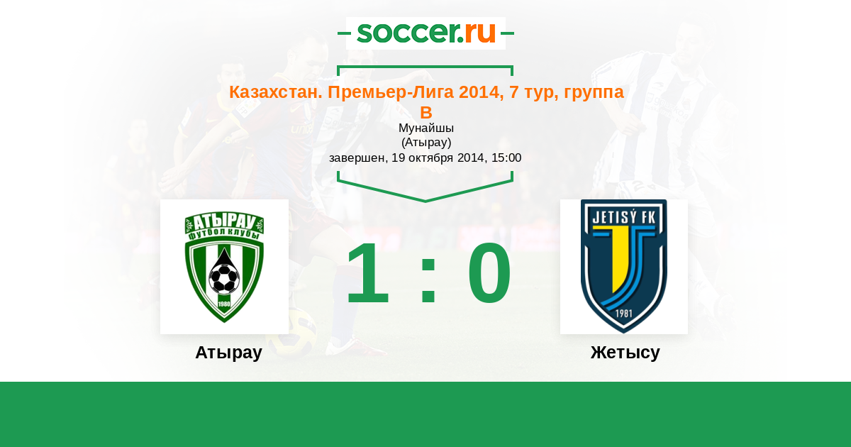 Казахстан. Премьер-лига 14.09.2014 Жетысу Логотип футбольный клуб Жетысу (Талдыкорган) 1:0 Логотип футбольный клуб Атырау Атырау
