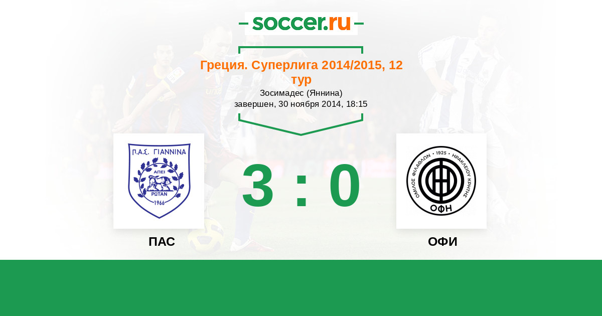 Греция. Суперлига 24.11.2012 ПАС Логотип футбольный клуб ПАС (Яннина) 1:0 Логотип футбольный клуб ОФИ (Ираклион) ОФИ