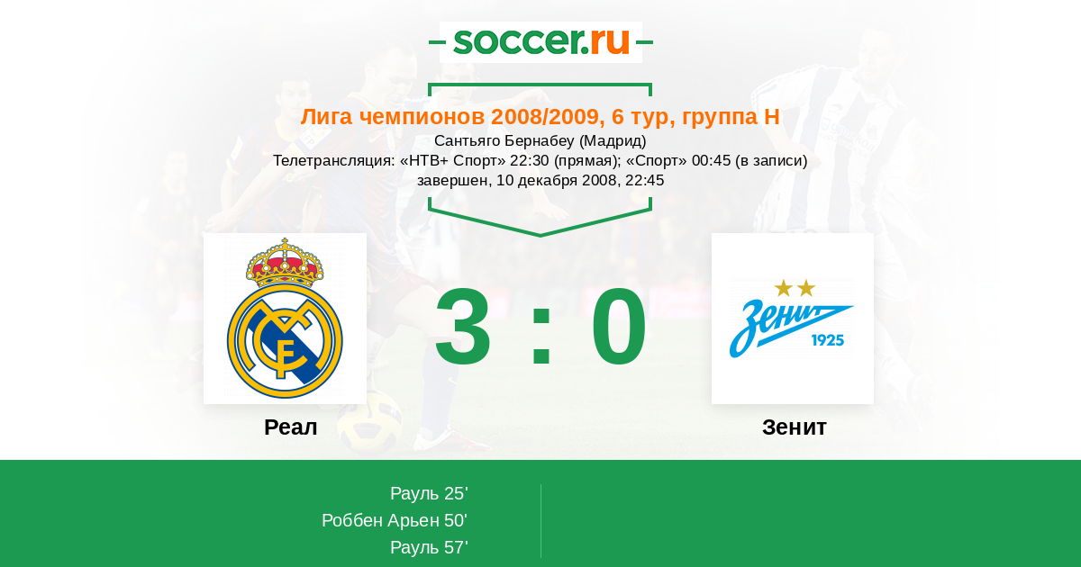 Протокол матча Реал против Зенит