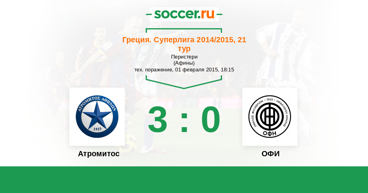 Греция. Суперлига 26.03.2014 ОФИ Логотип футбольный клуб ОФИ (Ираклион) 2:0 Логотип футбольный клуб Атромитос (Перистери) Атромитос