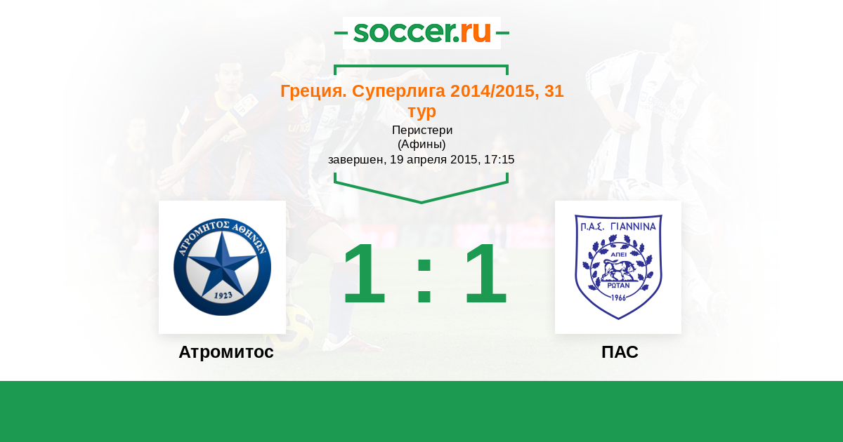 Греция. Суперлига 14.12.2014 ПАС Логотип футбольный клуб ПАС (Яннина) 1:0 Логотип футбольный клуб Атромитос (Перистери) Атромитос
