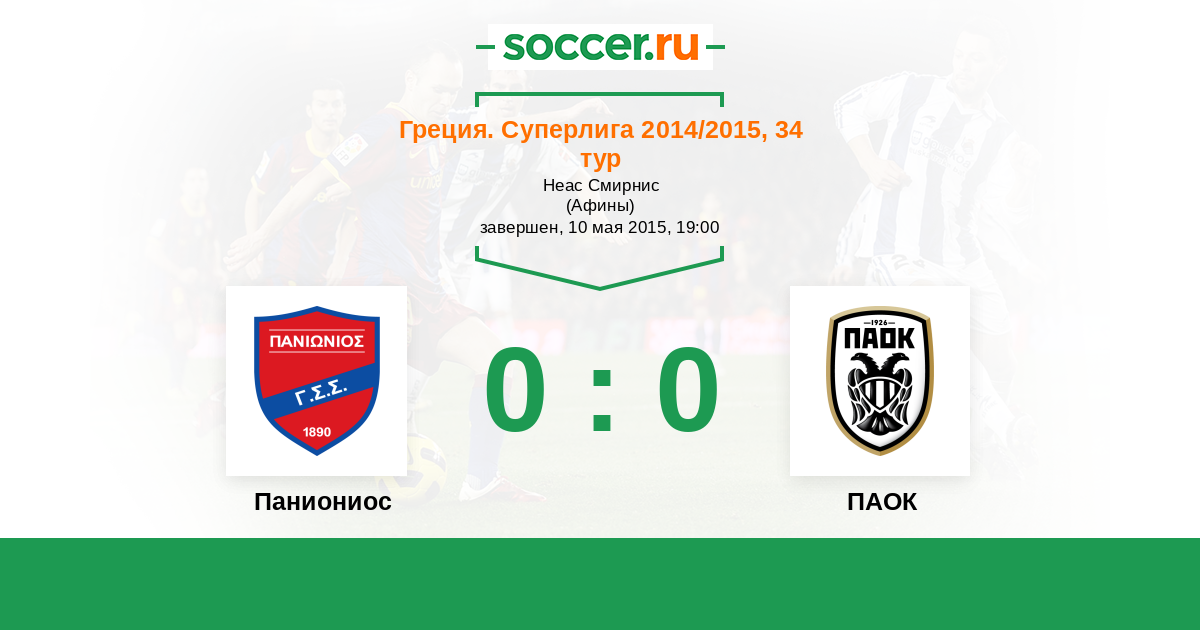 Греция. Суперлига 23.05.2016 Паниониос Логотип футбольный клуб Паниониос (Афины) 0:2 Логотип футбольный клуб ПАОК (Салоники) ПАОК