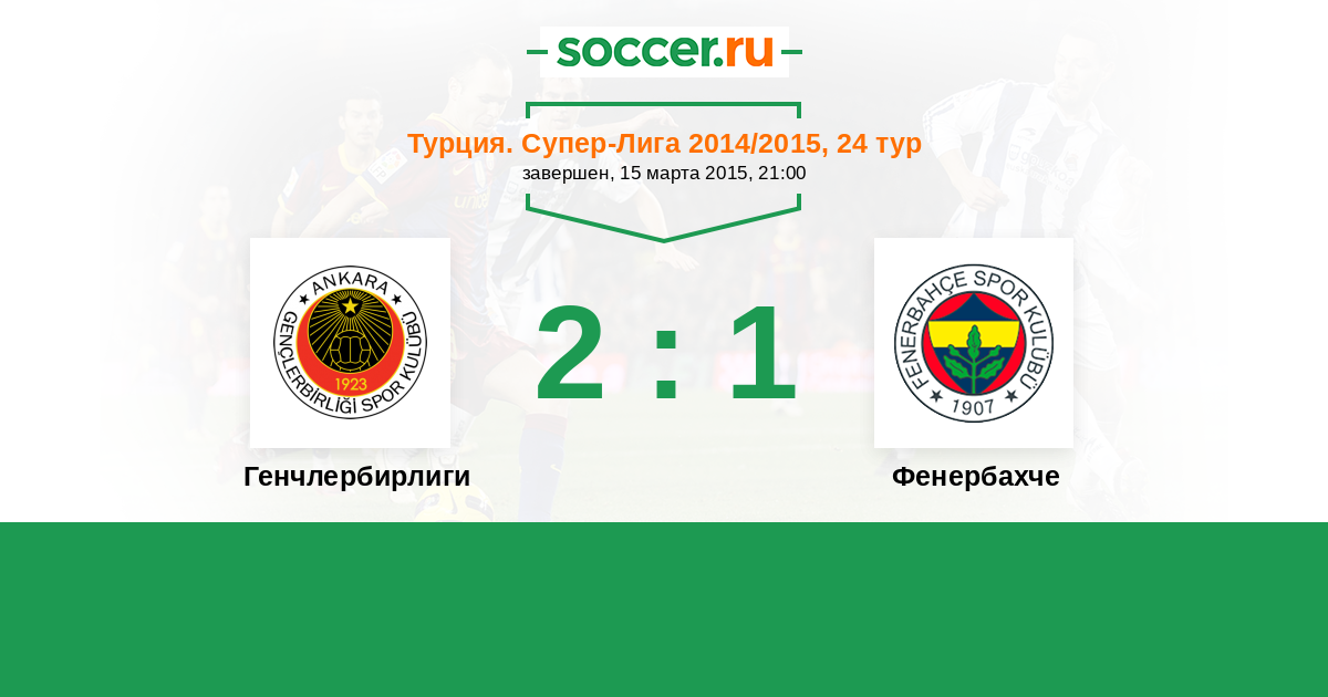 Турция. Суперлига 20.12.2015 Генчлербирлиги Логотип футбольный клуб Генчлербирлиги (Анкара) 0:1 Логотип футбольный клуб Фенербахче (Стамбул) Фенербахче