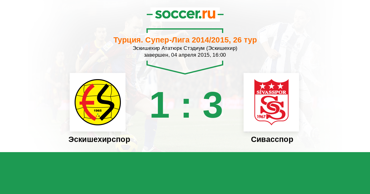 Турция. Суперлига 07.04.2013 Эскишехирспор Логотип футбольный клуб Эскишехирспор 2:1 Логотип футбольный клуб Сивасспор Сивасспор