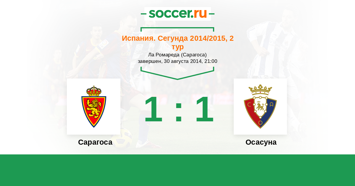 Испания. Сегунда 20.09.2015 Сарагоса Логотип футбольный клуб Сарагоса 0:1 Логотип футбольный клуб Осасуна (Памплона) Осасуна