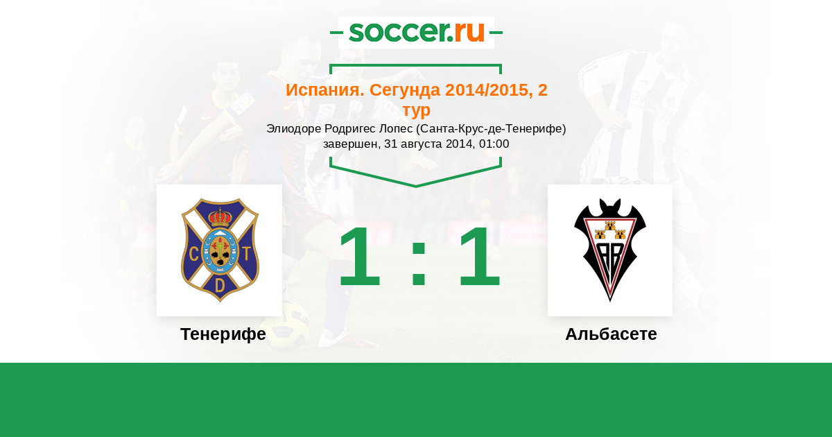 Испания. Сегунда Б: Группа 1 11.09.2011 Альбасете Логотип футбольный клуб Альбасете 1:2 Логотип футбольный клуб Тенерифе (Санта-Крус-де-Тенерифе) Тенерифе