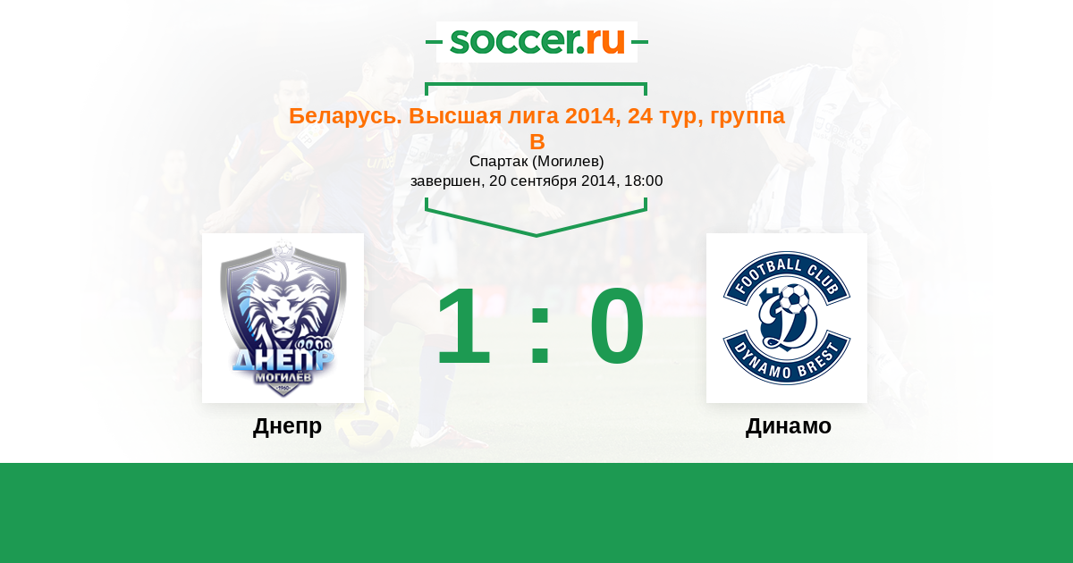 Беларусь. Высшая лига 09.08.2014 Днепр Логотип футбольный клуб Днепр (Могилев) 0:1 Логотип футбольный клуб Динамо (Брест) Динамо