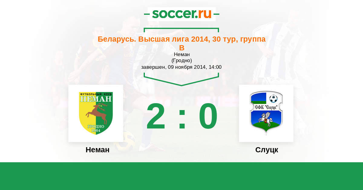Беларусь. Высшая лига 11.06.2014 Слуцк Логотип футбольный клуб Слуцк 0:2 Логотип футбольный клуб Неман (Гродно) Неман