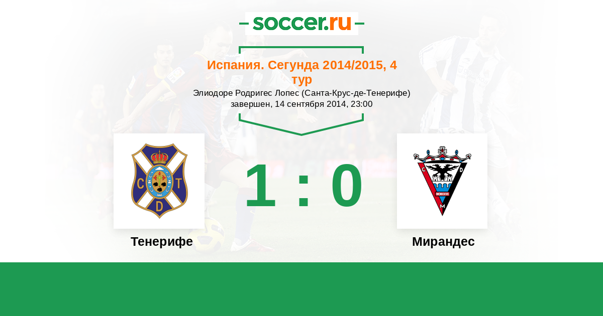 Испания. Сегунда 27.09.2015 Тенерифе Логотип футбольный клуб Тенерифе (Санта-Крус-де-Тенерифе) 3:0 Логотип футбольный клуб Мирандес (Миранда де Эбро) Мирандес