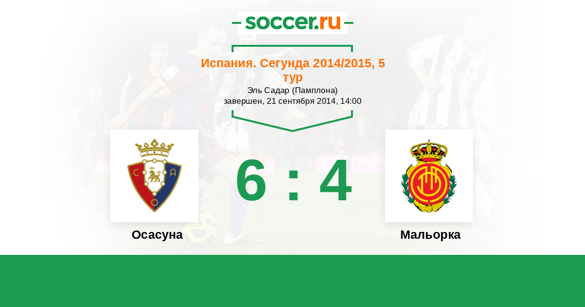 Испания. Примера 16.09.2012 Осасуна Логотип футбольный клуб Осасуна (Памплона) 1:1 Логотип футбольный клуб Мальорка (Пальма-де-Мальорка) Мальорка