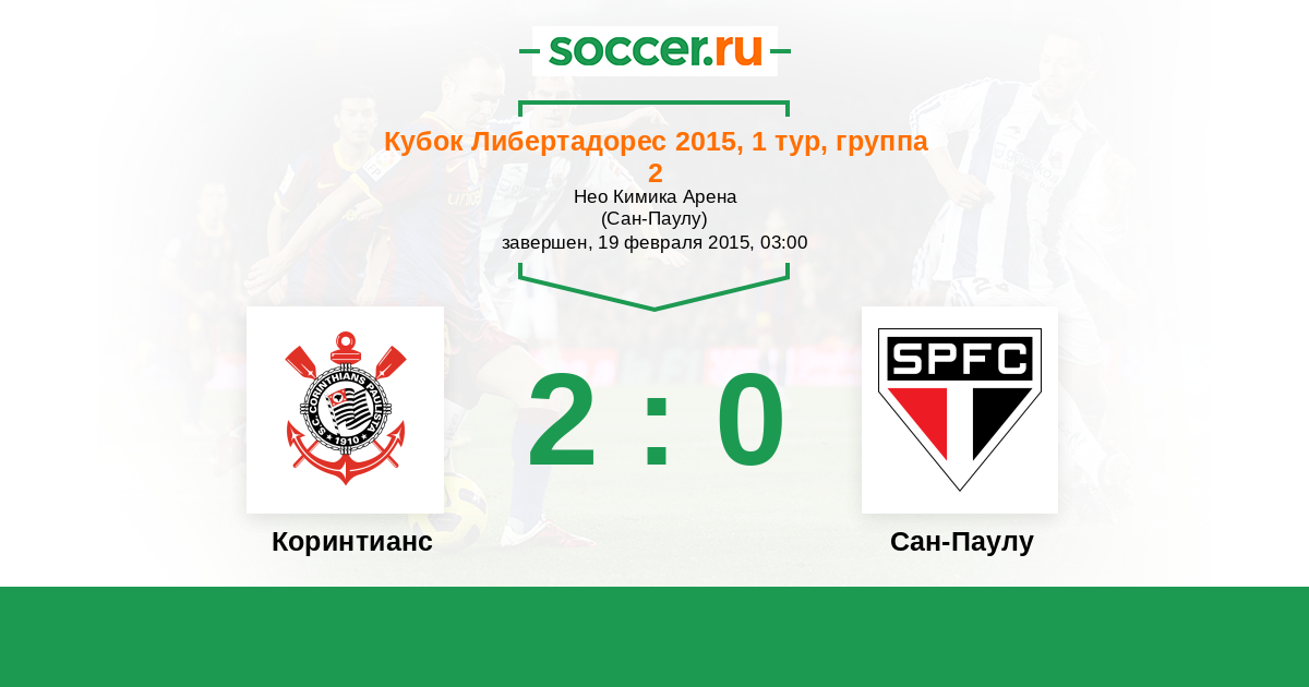 Кубок Либертадорес 23.04.2015 Сан-Паулу Логотип футбольный клуб Сан-Паулу 2:0 Логотип футбольный клуб Коринтианс (Сан-Паулу) Коринтианс