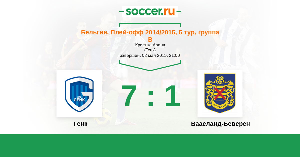 Бельгия. Про-Лига 11.04.2015 Ваасланд-Беверен Логотип футбольный клуб Ваасланд-Беверен 0:2 Логотип футбольный клуб Генк Генк