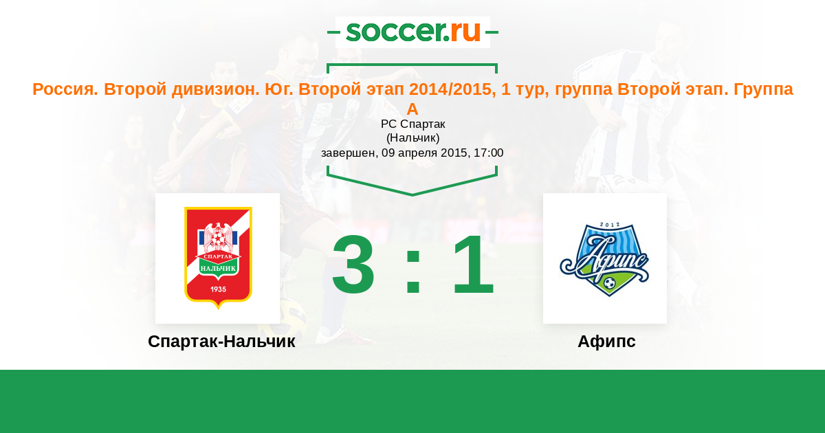 Россия. Вторая лига. Группа 1 14.05.2015 Афипс Логотип футбольный клуб Афипс (Афипский) 2:0 Логотип футбольный клуб Спартак-Нальчик Спартак-Нальчик