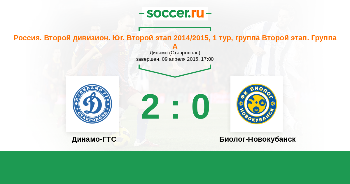 Россия. Вторая лига. Группа 1 14.05.2015 Биолог-Новокубанск Логотип футбольный клуб Биолог-Новокубанск 1:2 Логотип футбольный клуб Динамо-ГТС (Ставрополь) Динамо-ГТС
