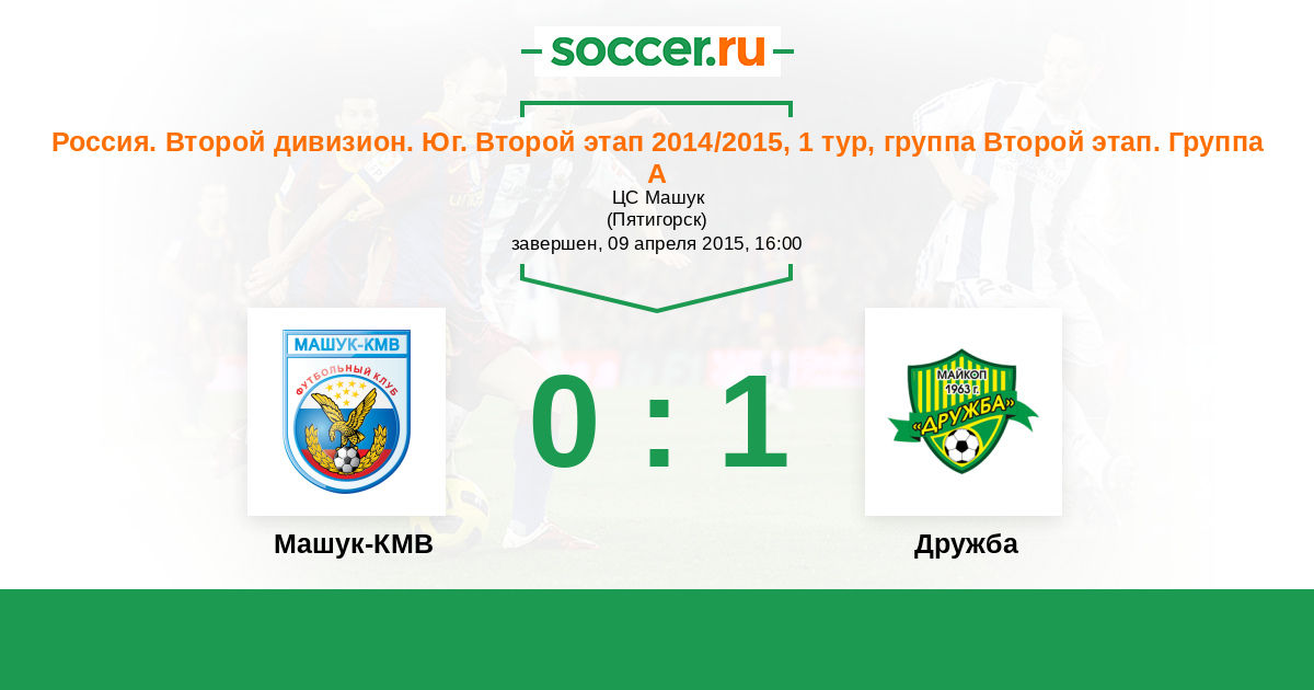 Россия. Вторая лига. Группа 1 11.04.2009 Машук-КМВ Логотип футбольный клуб Машук-КМВ (Пятигорск) 1:1 Логотип футбольный клуб Дружба (Майкоп) Дружба