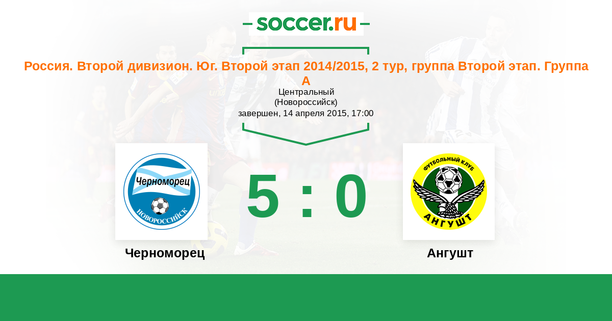 Россия. Вторая лига. Группа 1 09.05.2015 Ангушт Логотип футбольный клуб Ангушт (Назрань) 0:1 Логотип футбольный клуб Черноморец (Новороссийск) Черноморец