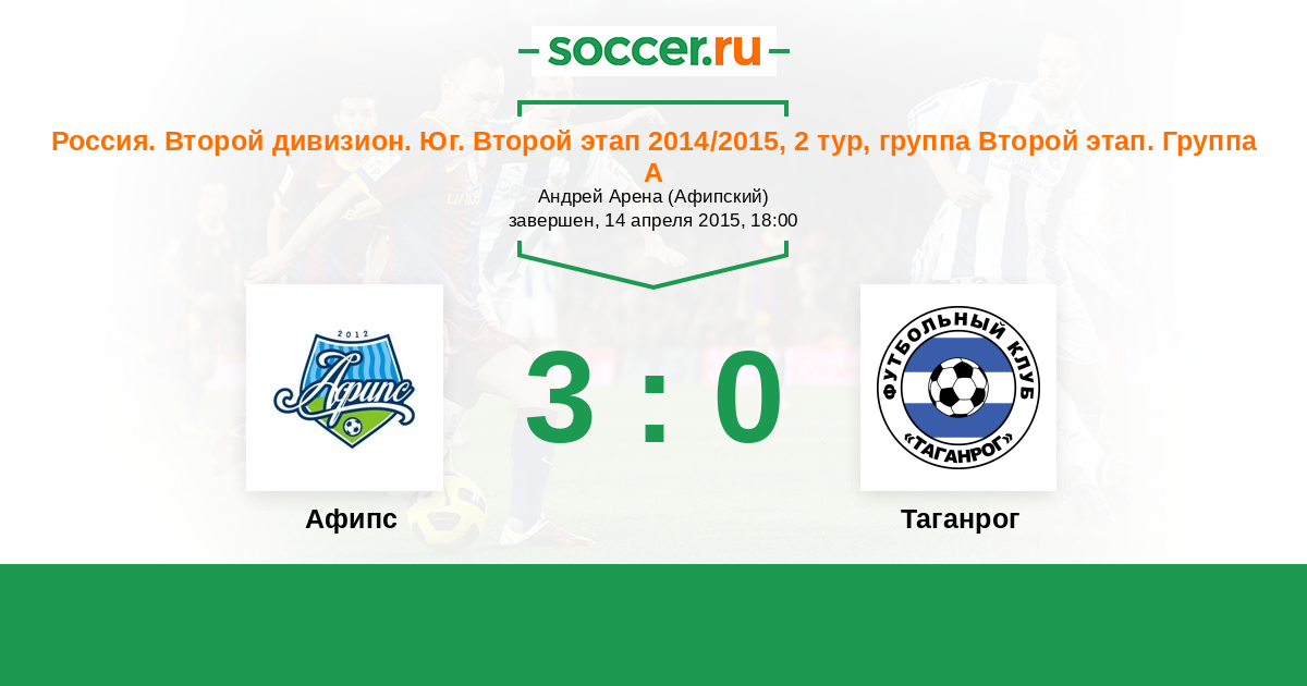 Россия. Вторая лига. Группа 1 09.05.2015 Таганрог Логотип футбольный клуб Таганрог 1:1 Логотип футбольный клуб Афипс (Афипский) Афипс